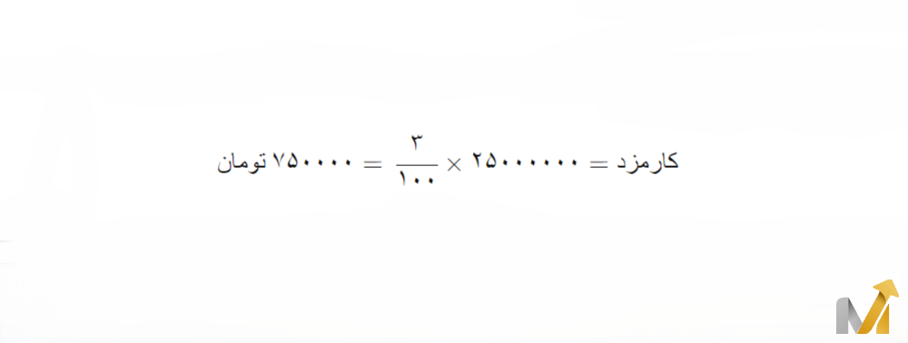 برای مثال، اگر شما یک طلا رو به قیمت ۲۵۰۰۰۰۰۰ تومان خریدین و فروشنده کارمزد ۳ درصد تعیین کرده، محاسبه کارمزد به صورت زیره:
